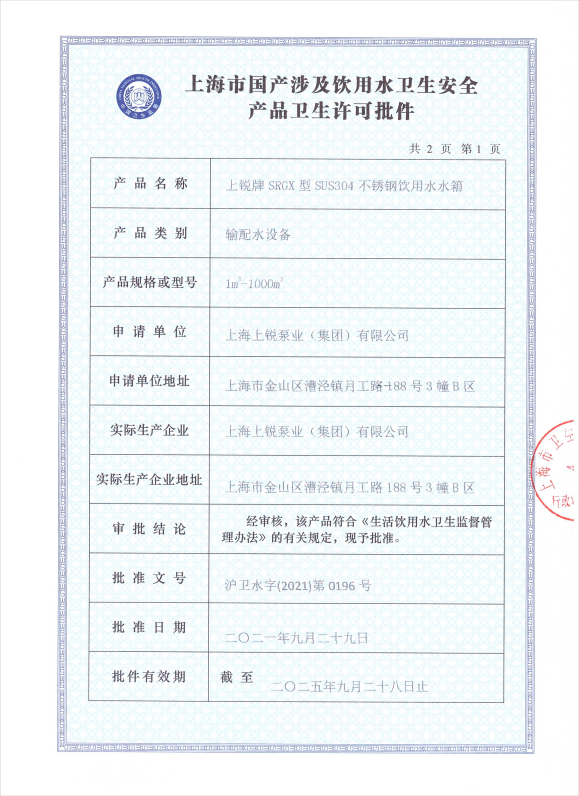 箱式供水設備衛生許可批件